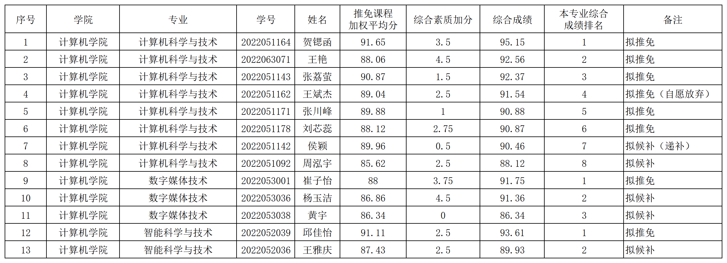 2026届推荐优秀本科毕业生免试攻读研究生拟推荐名单和候补名单